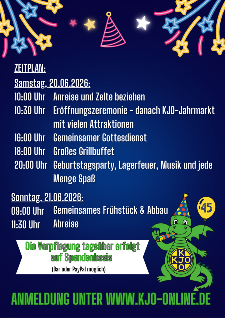 Freu dich auf unseren KJO-Jahrmarkt mit vielen Aktionen, ein leckeres Grillbuffet und eine ausgelassene Party am Abend.